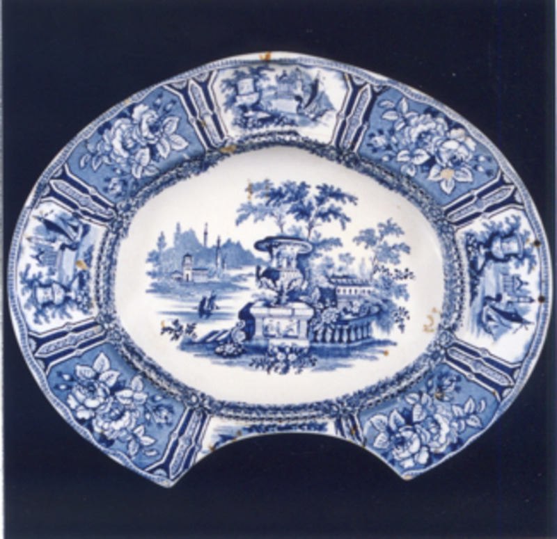 Bacía de barbeiro de forma ovalada. Decorada con estampados en azul cobalto. O tema principal representa unha viñeta cun gran xardín victoriano caracterizado pola presenza dunha gran floreiro clásico en primeiro termo, balaustres, escalinatas, río sobre o que navega unha góndola, Na á, decoración a base de viñetas con paisaxes idénticas ao central, alternando con rosas. Na parte inferior o xardín repítese dúas veces.