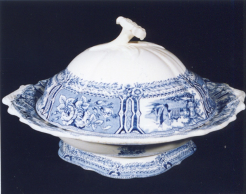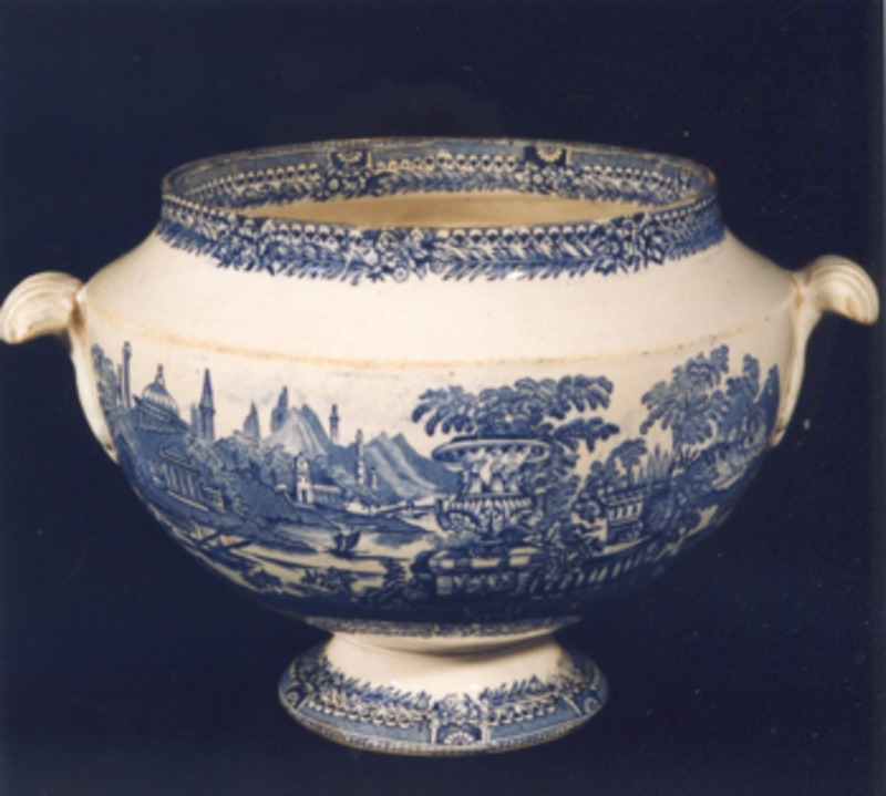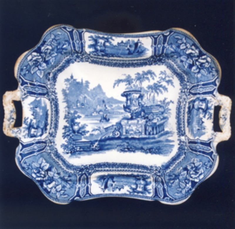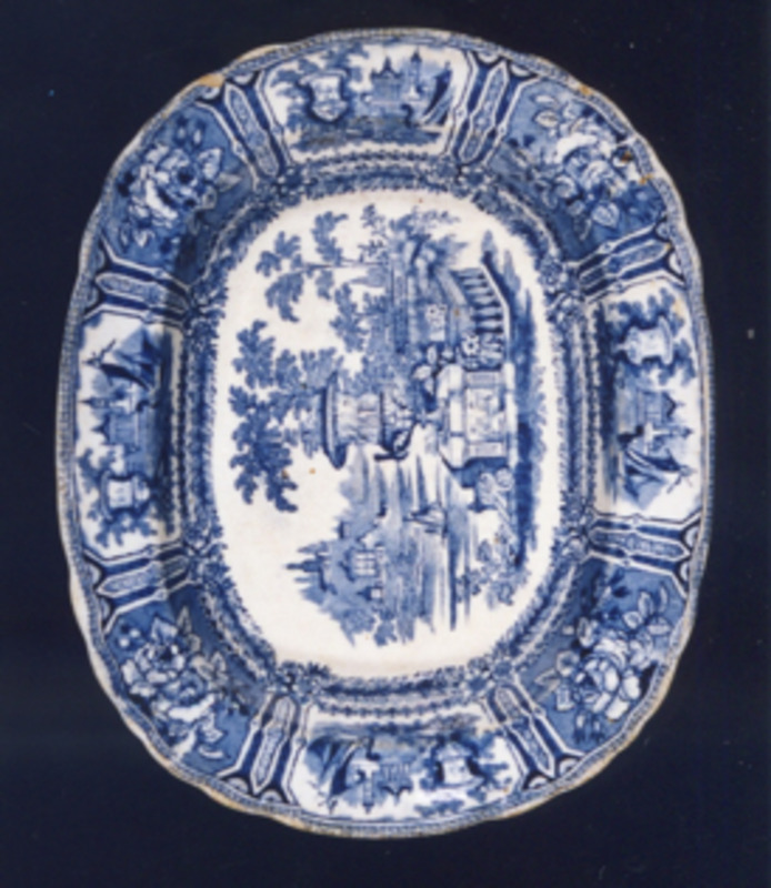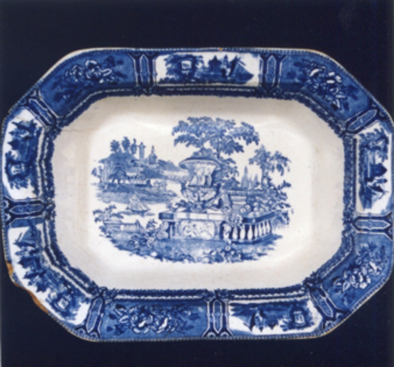 Fonte chaira, ovalada, co bordo en ondas. Decoración estampada en azul cobalto. Tema principal: xardín imaxinario tipo "Góndola". Trátase dun xardín victoriano, é unha viñeta de composición escenográfica na que destaca en primeiro termo un gran floreiro de xardín clásico, balaustres, escalinatas e río en zig-zag sobre o que navega unha pequena embarcación a vela.