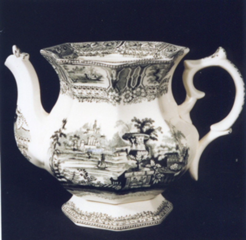 Teteira labiada, de molde, de base octogonal. Decorada con estampados en negro.