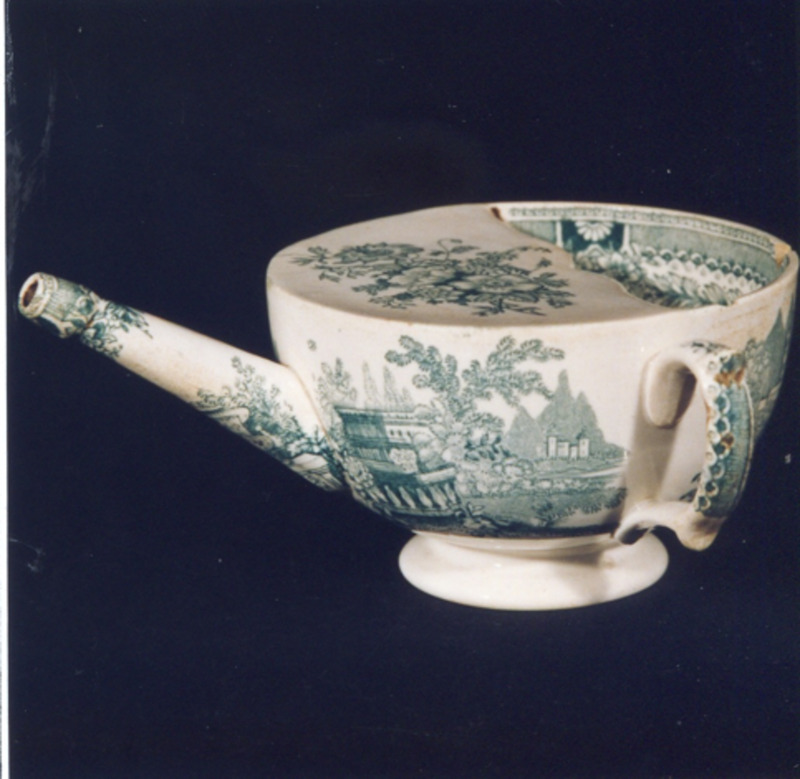 Pistero con asa lateral para beber na cama. Decoración a base de estampados verdes. O tema principal, consistente nunha viñeta con xardín fantástico tipo "Góndola", localízase no bandullo e continúa no pitorro: caracterízase pola existencia dun gran floreiro clásico, balaustre, vexetación abundante e lago con góndola (típica paisaxe victoriana).