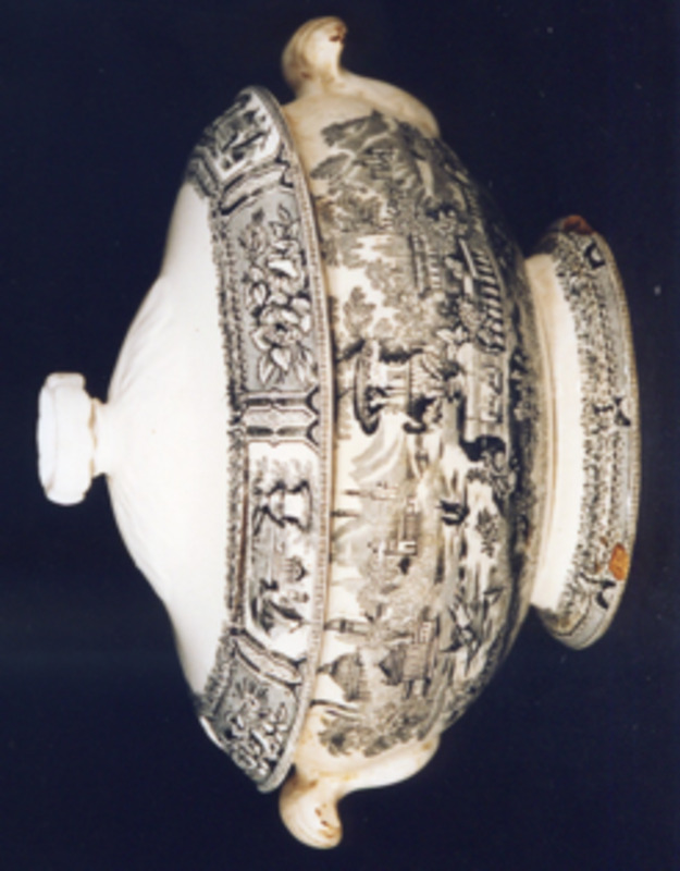 Sopeira de forma ovalada con dúas asas que rematan en venera. Tapa con remate de flor e follas en relevo. Estampados en negro.