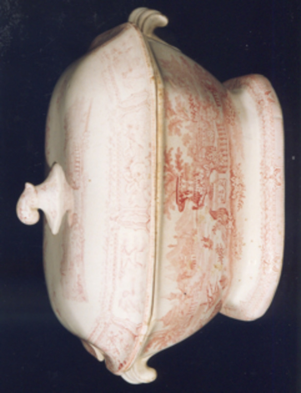 Sopeira alongada con dúas asas laterais e remate na tapadeira. Decoración estampada en rosa.