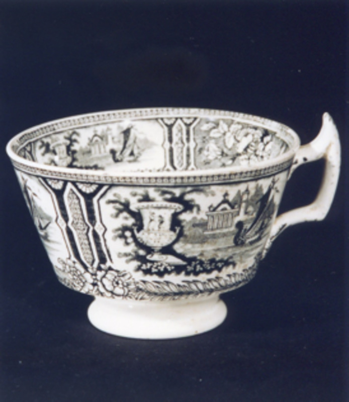 Cunca de almorzo con decoración estampada en negro a base de sucesión de viñetas con paisaxes "Góndola", caracterizados pola existencia dun gran floreiro clásico en primeiro termo, edificios clásicos, góndola... que se van alternando, na parte interior, con rosas e na exterior repítense un tras outro, idénticos.