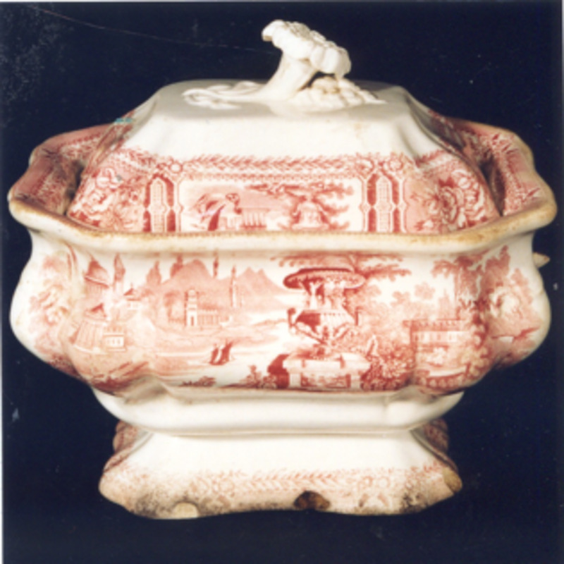 Sopeira de planta octogonal, moi labiada, con remate de flor na tapadeira. Decoración estampada en rosa.