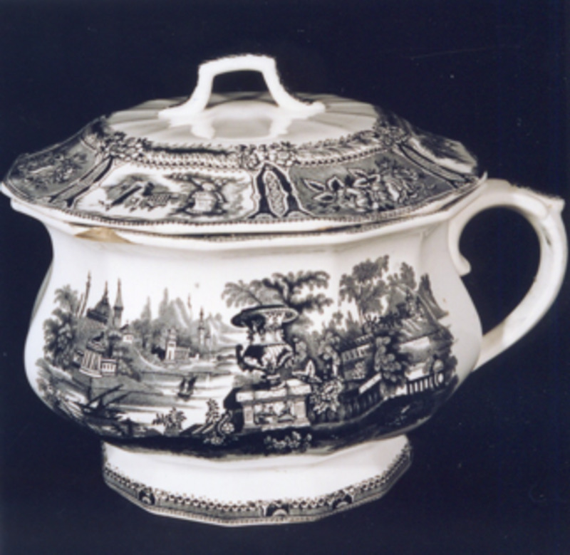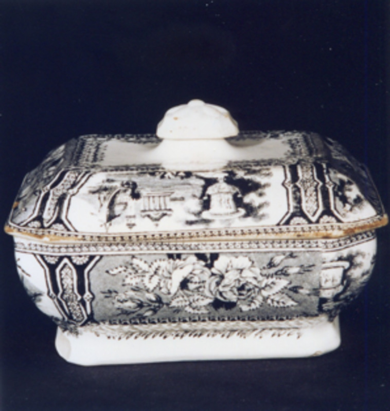 Azucreiro de forma redonda con dúas asas laterais en forma de cuncha. Tapa con pomo de relevo vexetal. Decoración estampada en granate, unha mesma viñeta dáse en ambas as caras do recipiente: trátase dun xardín imaxinario victoriano, caracterizado por un gran floreiro clásico en primeiro plano, balaustres, abundante vexetación, escalinatas ata a auga onde navega unha pequena embarcación a vela. Ao fondo e bordeando o río, edificios clásicos, montañas... O modelo é inglés.