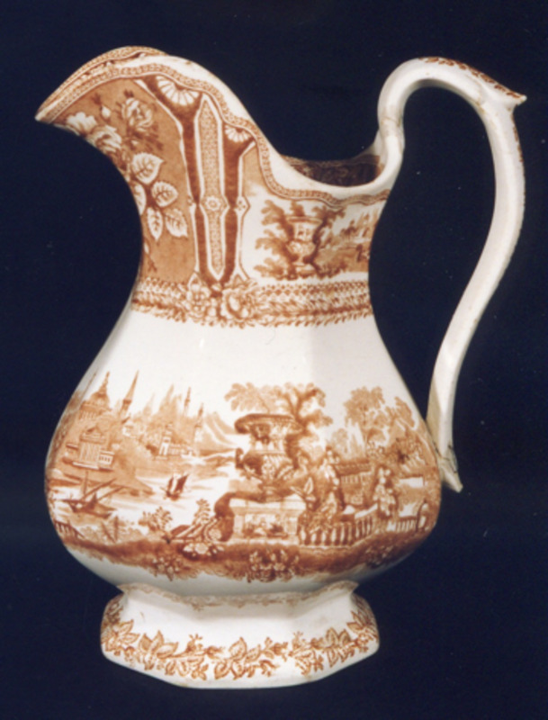 Orinal de forma ochavada con decoración estampada en marrón, tipo "xardíns irreais", localízase no bandullo da peza (dúas veces o mesmo debuxo), son dúas viñetas idénticas que representan un xardín victoriano. Están caracterizados pola presenza dun gran floreiro en primeiro plano, clásico; vexetación abundante, balaustre, escalinatas que baixan ata un río que discorre en zig-zag sobre o que navegan unhas pequenas embarcacións a vela. Á marxe esquerda do río e en planos máis afastados: edificios, montañas... Decoración de orla no bordo, base e asa.