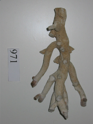 Semella unha ponla dunha árbore con varias ramificacións cortas. Cor branca misturada con tonos grises e marelos cerca do pé. Ten aspecto duro ainda que fráxil e quebradizo.