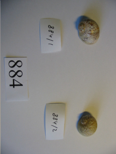 2 cunchas. Ombligo aberto. Cor: manchas marróns sobre fondo branco. Superficie lisa. Espiral redondeada bastante plana. Opérculo con capa calcárea externa.