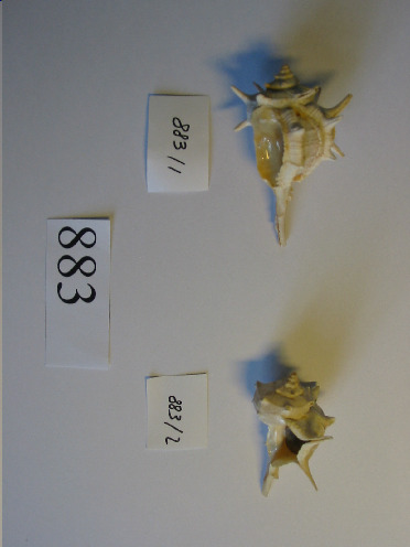 2 cunhas,cor: periostraco pardo claro, exterior branco amarelo con liñas e surcos concéntricos. Cuncha robusta. Se a observamos con lupa, os dentes cardinais aparecen finamente crestados.