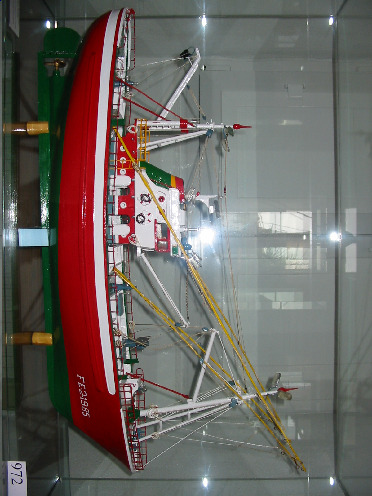 Barco de tres paos sen velamen, tres botes salvavidas, tres bandeiras: vermella, azul e amarela e verde e vermella, tamén leva a española. Cores: verde e branco no casco.