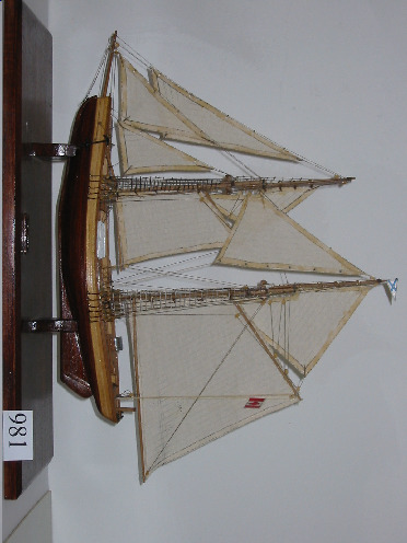 Alto relevo do veleiro "S. Álvarez" de tres paos e co velamen desplegado. Bandeiras española e galega, casco azul e branco, áncora vermella. Protexido cun caixón con cuberta de cristal.