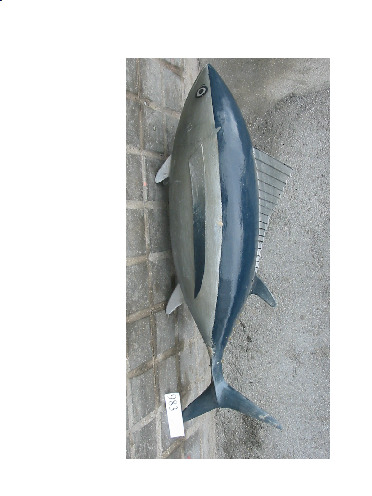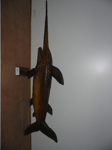 Peixe espada de madeira. Todo feito nunha peza. Ten unha peana na que se sostén. Está labrado facendo debuxo ó longo do corpo. Na peana ten gravada a cifra 2002 e tamén o nome de quen o fixo.