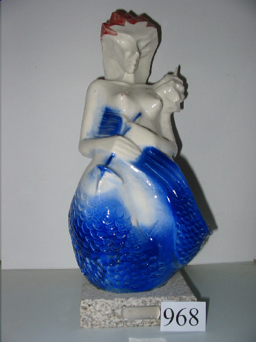 Peixe espada de madeira nun soporte. Está decorado con motivos xeométricos. Na base por: R Ansede Caínzos". Os dentes do peixe está feitos con puntas moi pequenas.