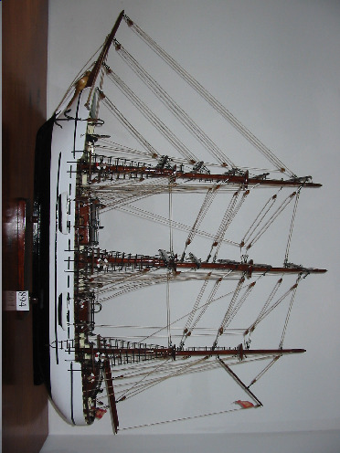 Tres paos, 62 cañóns repartidos en tres cubertas. Policromado con branco, marrón, azul, negro, amarelo, verde e vermello. Na proa ten unha cuncha e un escudo.