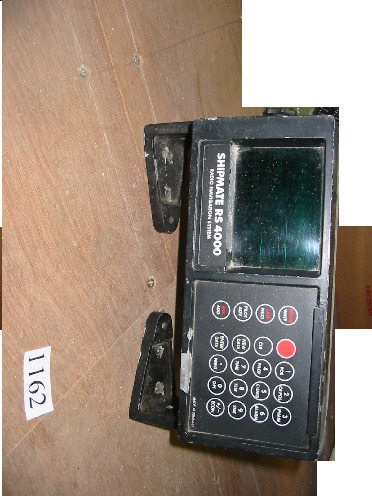 É unha caixa metálica negra, ten unha pantalla negra nun lado e no outro unha computadora dixital. Ten escrito: Radio Navegation System Shipmate RS 4000