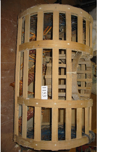 A estructura é de madeira con catro aros dobres e dezaoito varillas. Nos laterais ten pano de rede de cor azul. O funil é de madeira. No lado oposto ó funil ten dous pedazos de cemento. No interior ten tres langostas disecadas.