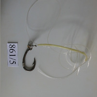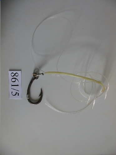 - Patilla curvada con argola cun emerillón que une a liña. Cana curvada, ten unha abrazadeira tamén de aceiro. Pico torcido e moi afiado. Prateado oscuro. Camisa de goma: 17 cm. Amarela fluorescente. Fio de nailon de 189 cm.