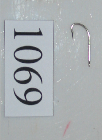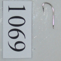 - Anzol de patiña plana, cana recta, curva torcida, pico lixeiramente torcido e galla pequena. É de cor prateado brillante