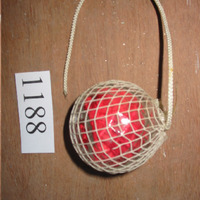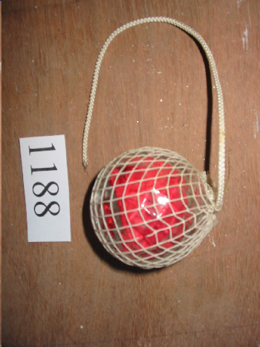 - Boia de cristal transparente. Está cuberta por malla de rede de cor branca. Parece que no interior ten un anaco de tea de cor vermello. Ten un fio atado á rede.