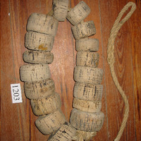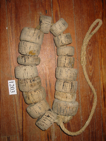 - 17 pezas de corcho circulares furadas polo medio. Están unidas entre sí pola corda que as atravesa polo medio.