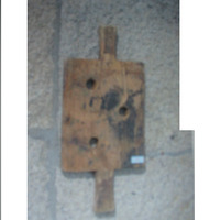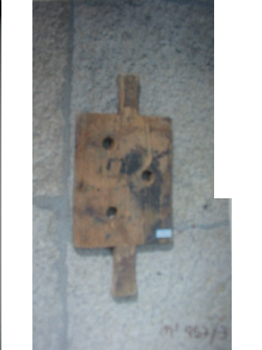 - Base de madeira de forma rectangular con tres orificios e dúas prolongacións máis estreitas en cada lado a modo de agarradeiras.
