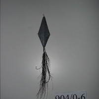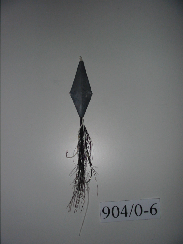 - A parte de metal ten forma romboide, dela sae un mechón de crin e dous cordeliños brancos, ó final destes cordeliños van atados dous anzois. O anzol máis grande ten cravado unha tira de plástico de cor branca (cebo artificial)