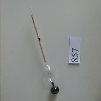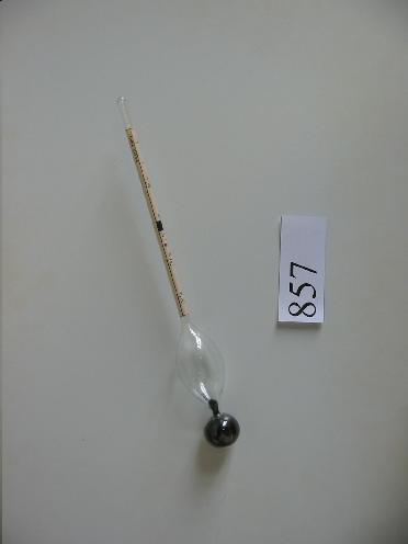 - Forma cilíndrica alongada con escala de densidades en papel, seguida dunha parte ovoidal valeira e rematando nun bulbo esférico cheo de boliñas que actúa como contrapeso.