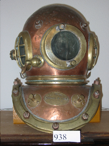 - Casco de cobre con tres ventanas guarnecidas de fortes vidros. O casco iría atornillado ó peto ou coraza de bronce. Presenta a inscripción: "Siebe Gorman & Co Ltd, submarine engineer, London Patent".