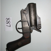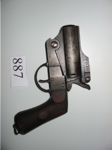 - Pequena pistola de cor gris escura e marrón na empuñadura. O canón é curto. Ten unha argola na culata. A abertura do canón é dun diámetro de 2,1 cm.