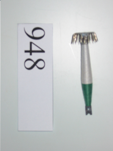 - Poteira pequena, cunha coroa de alfinetes, ó redor está recuberta de fío verde e branco, predomina o branco.