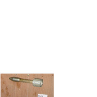 - Proxectil con punta redondeada, corpo cilíndrico, 4 aspas. No corpo ten pegado un papel no que indica as características, marca, modelo, etc.
