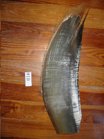 - Balaenoptera musoulus (Rorcual azul). Barbas negras longas e fortes con estrias perpendiculares á liña de fleques.