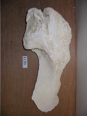 - É de cor branco, moi poroso, a zona máis porosa ten unha tonalidade máis escura. Ten forma semiesférica con unha ramificación. Pode ser o arranque dunha costela.