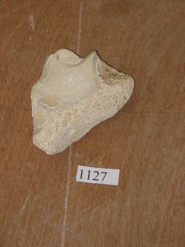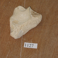 - É un fragmento moi pequeño que formou parte doutros máis grande. Nunhas zonas a superficie é moi lisa e de cor branca, noutras partes é moi poroso e de tonalidade máis amarela.