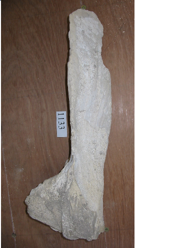 - Óso con forma esférica do que sae unha ramificación. Pode ser o arranque dunha costela. É de cor branca. Unha parte é moi porosa e outra lisa.