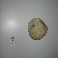 - Peza de granito redondeada cun pequeño oco por donde asoman pequenos ciristaliños de cuarzo transparente agrupados.
