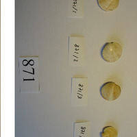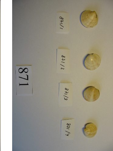 - 4 cunchas sólidas, equilátera e inequilateral, coa cima frontal e centrada. Contorno netamente circular. Costelas planas e concéntricas con ata 35 por cm. Cor: branca sucia, manchas marróns.