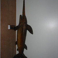 - Peixe espada de madeira. Todo feito nunha peza. Ten unha peana na que se sostén. Está labrado facendo debuxo ó longo do corpo. Na peana ten gravada a cifra 2002 e tamén o nome de quen o fixo.
