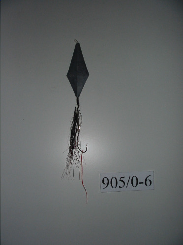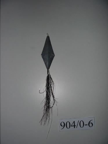 A parte de metal ten forma romboide, dela sae un mechón de crin e dous cordeliños brancos, ó final destes cordeliños van atados dous anzois. O anzol máis grande ten cravado unha tira de plástico de cor laranxa (cebo artificial).