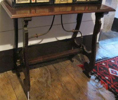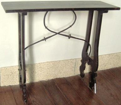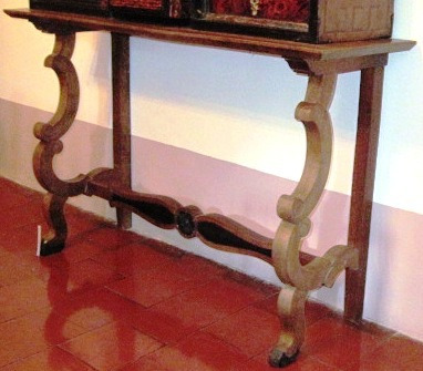 Mesa tipo buffet que serve de soporte ao bargueño. En madeira de catro pés de lira, de perfil avolutado en forma de C os dianteiros, e unidos cunha cabia inferior tallada en forma de flor pintada en negro.