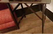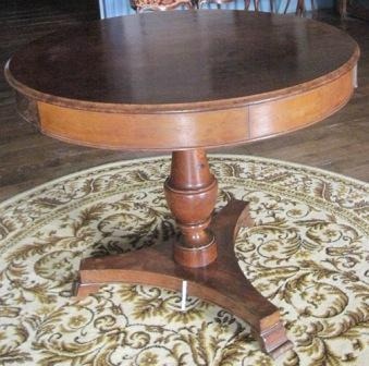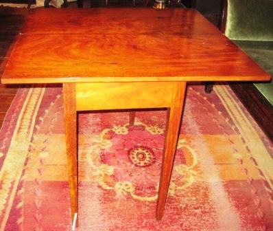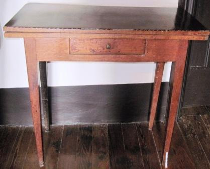 Mesa de xogos con tapa abatible. Aberta, un taboleiro de xogo de cartas en madeira de caoba con incrustacións de marquetería que forman rosas dos ventos. Caixón frontal. Apoiada en catro patas afusadas, unha delas abatible (que se abre para suxeitar o taboleiro cando a tapa está aberta)