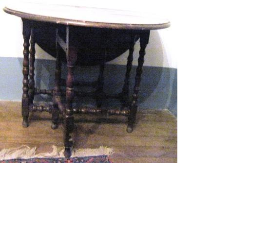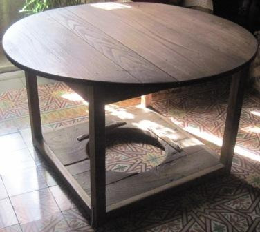 Mesa encartable de centro en madeira de castiñeiro con dúas ás pregables e dous caixóns laterais (un a cada lado) e oito patas en madeira torneada e aneis lenticulares (dúas delas abatibles).