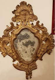 Cornucopia tallada en madeira dourada de perfil mixtilíneo e motivos de rocalla e volutas en forma de C en estuco coroado cun copete con pinxante fitomórfico. Á parte da lúa do espello fáltalle o azogue e o marco presenta algunha falta.