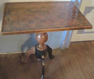 Mesa de xogos co taboleiro do xadrez debuxado e nos extremos motivos vexetais de roleos, que se sostén nun soporte central rematado en tres pequenas patas avolutadas.