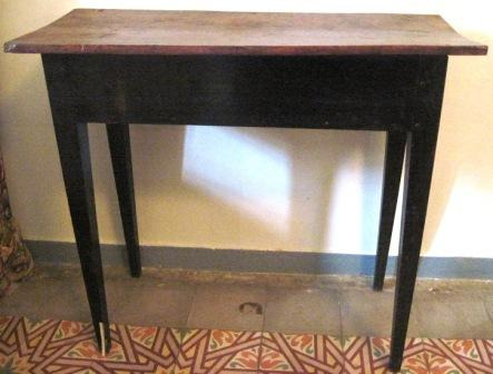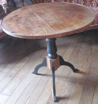 Mesa velador en madeira de castiñeiro que se sostén nun soporte central rematado con tres pequenas patas avolutadas (soporte e patas pintadas en negro).