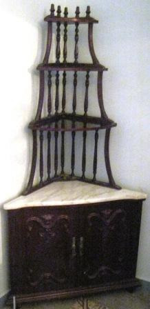 Moble esquineiro; a parte inferior cunha lacena con dúas portas e aplicacións en madeira tallada, repisa en mármol e parte superior tres estantes con barrotes.