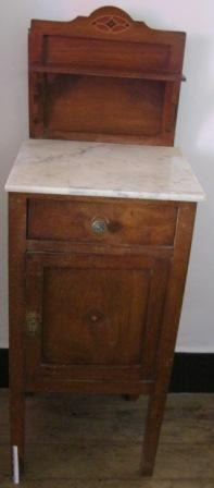 Mesa de noite en madeira de castiñeiro. Na parte inferior lacena cunha balda, na superior un caixón e tiradores en metal branco. Parte de arriba en mármore branco.