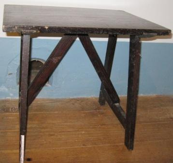 Mesa de noite con taboleiro en marquetería de marfil e óso, e motivo decorativo no emblema central dun paxaro, quizais un melro, tamén en marfil, acompañado por trísceles de catro aspas no mesmo material. Catro patas en madeira torneada de cerdeira, de perfil lenticular, con fiadores de perfil eseado en ferro forxado. Probabelmente fora o soporte dun contador ou bargueño.