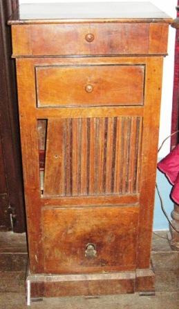 Mesa de noite en madeira de castiñeiro, coas súas esquinas cortadas en chafrán. Porta no frontal resalteada cun cadrón: dá paso á lacena interior, que conta cun estante e caixón. Repisa en mármore gris veteado con antepeito no fondo.
