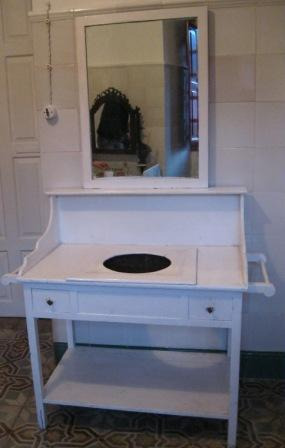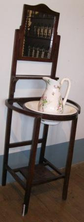 Palanganeiro en madeira de faia con espello na parte superior e almofía en louza branca. Nos laterais dous saintes para colgar toallas, do tipo que producía Thonet (vid. Nº 924)